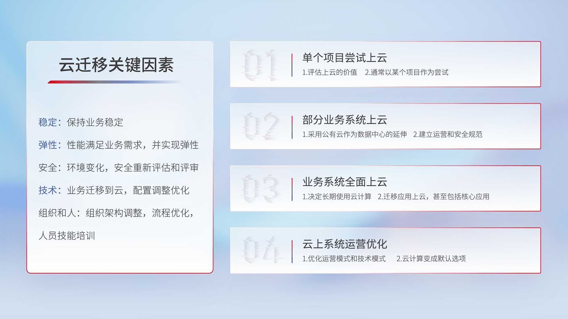 结合实际业务,,,,从规划设计、、云平台选型、、、、云原生改造、、、、数据迁移、、集成交付,,迁移全过程为客户识别最佳上云路径,,,,做好风险识别管理,,,设计网络架构、、身份权限、、安全审计合规、、、、操作审计、、、日志审计、、、、监控告警策略、、多站点容灾设计等,,对云上基础设施进行整体规划,,,,提升IT治理水平,,,以满足弹性、、、、高可用、、高性能的需求。。