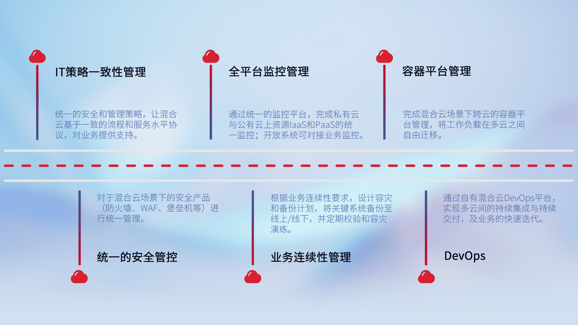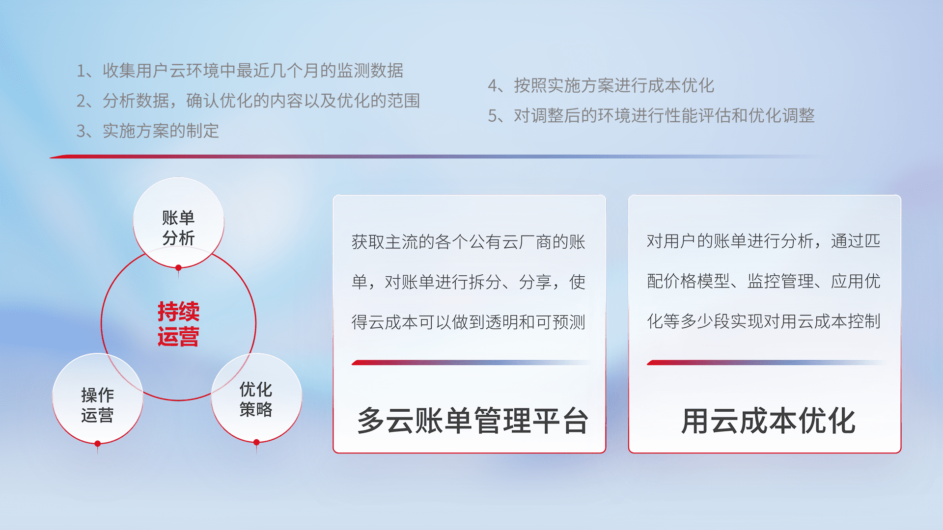 通过多云纳管,,,,以统一的资源数据模型把客户的云资源进行抽象和封装,,进而实现对多云资源的统一操作,,保障云资源管理的可靠性、、稳定性与可用性。。。量身定制化运维内容,,,配置、、、开发运维、、、、补丁管理、、、、备份、、监控、、、认证和访问管理、、审计和日常巡检等,,,,保障在用云过程中的可靠度,,,稳定度以及高可用率。。