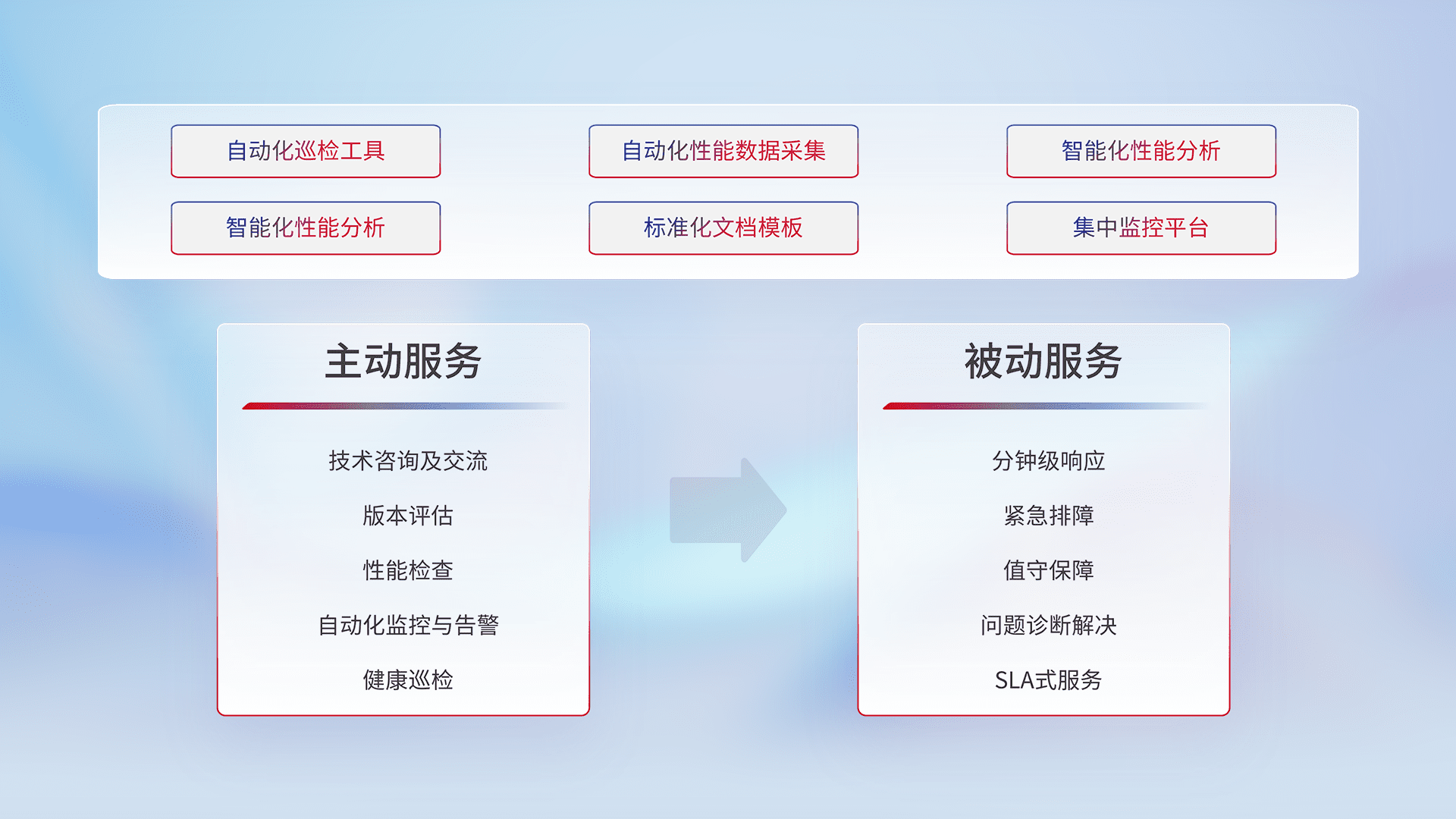 智能化工具和标准化文档,,,保障服务质量,,提供主动服务(包含技术咨询、、版本评估、、性能检查、、自动化监控与告警、、、、健康巡检)和被动服务包含(分钟级响应、、、紧急排障、、、、值守保障、、、、问题诊断解决、、、SLA服务)。。。