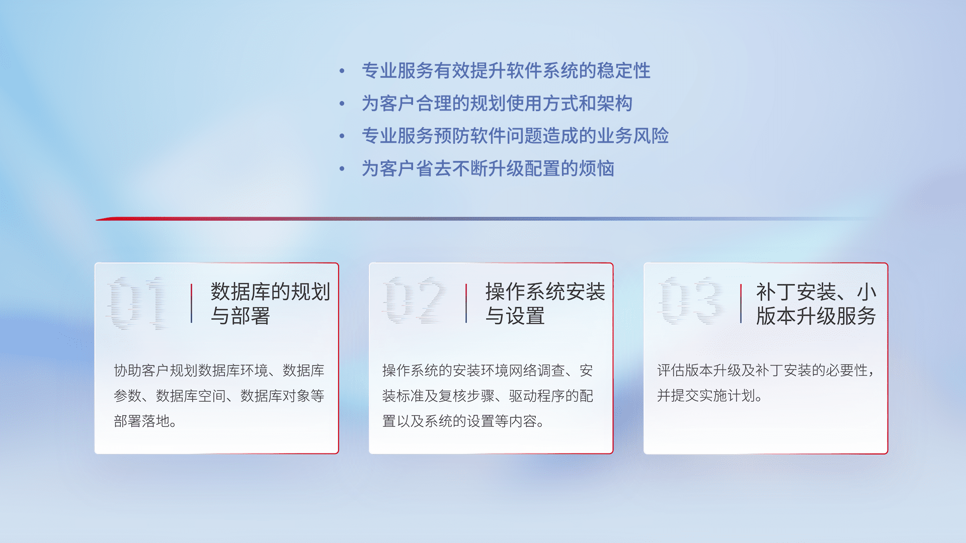 为客户提供软件规模升级、、、、快速部署、、按需配置的专业服务,,,,从数据库的规划与部署到操作系统的安装与设置,,,再到补丁安装和小版本升级提供支持。。。。